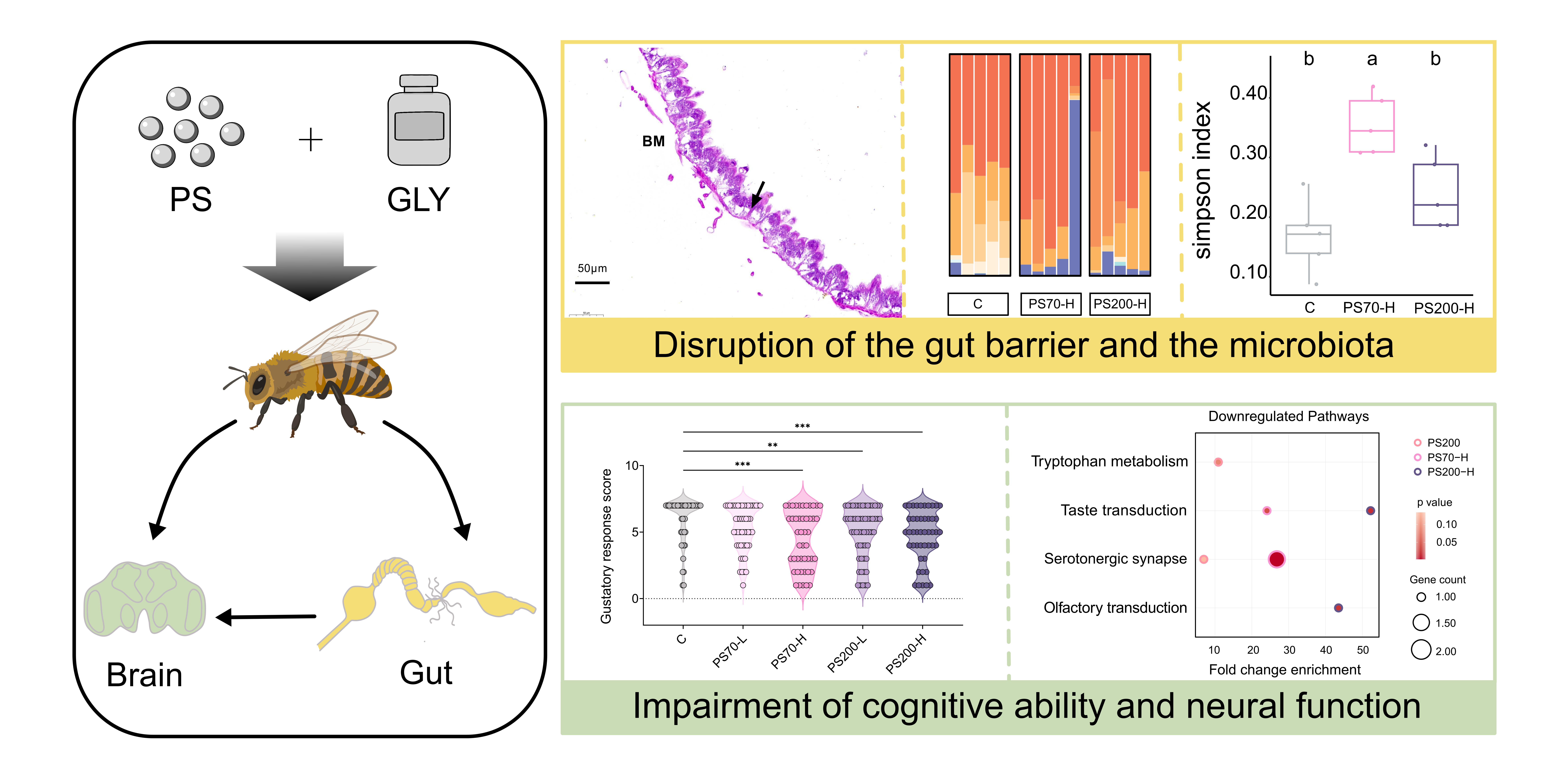研究表明,聚苯乙烯微塑料(PS)与草甘膦(GLY)单独或联合暴露未显著影响蜜蜂的体重与摄食量,但二者联合暴露显著提高了蜜蜂死亡率,并较单独处理组引发更为严重的中肠组织损伤;进一步研究发现,PS与GLY联合暴露导致蜜蜂肠道菌群结构紊乱、多样性降低;同时,肠道中与细胞增殖分化、氧化应激、解毒及免疫相关的基因表达显著下调,蜜蜂的肠道免疫功能受到严重破坏。此外,PS与GLY联合暴露显著降低了蜜蜂对蔗糖的敏感性,造成认知障碍。在蜜蜂的肠道和血淋巴中均检测出一定浓度的微塑料颗粒,表明微塑料能够穿过肠道屏障进入血淋巴,并可能进一步到达大脑组织。大脑转录组分析显示,血清素能突触通路相关基因表达下调,且相关基因的下调与肠道核心菌属Snodgrassella和Lactobacillus的变化显著相关,提示“肠-脑轴”可能在污染物诱导蜜蜂行为障碍中发挥关键作用。