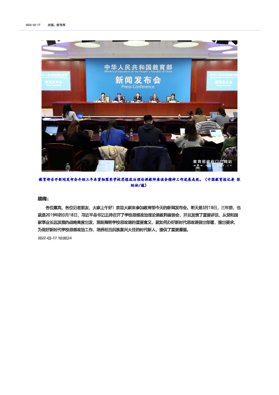 续梅: 各位嘉宾,各位记者朋友,大家上午好!欢迎大家来参加教育部今天的新闻发布会。明天是3月18日,三年前,也就是2019年的3月18日,... -