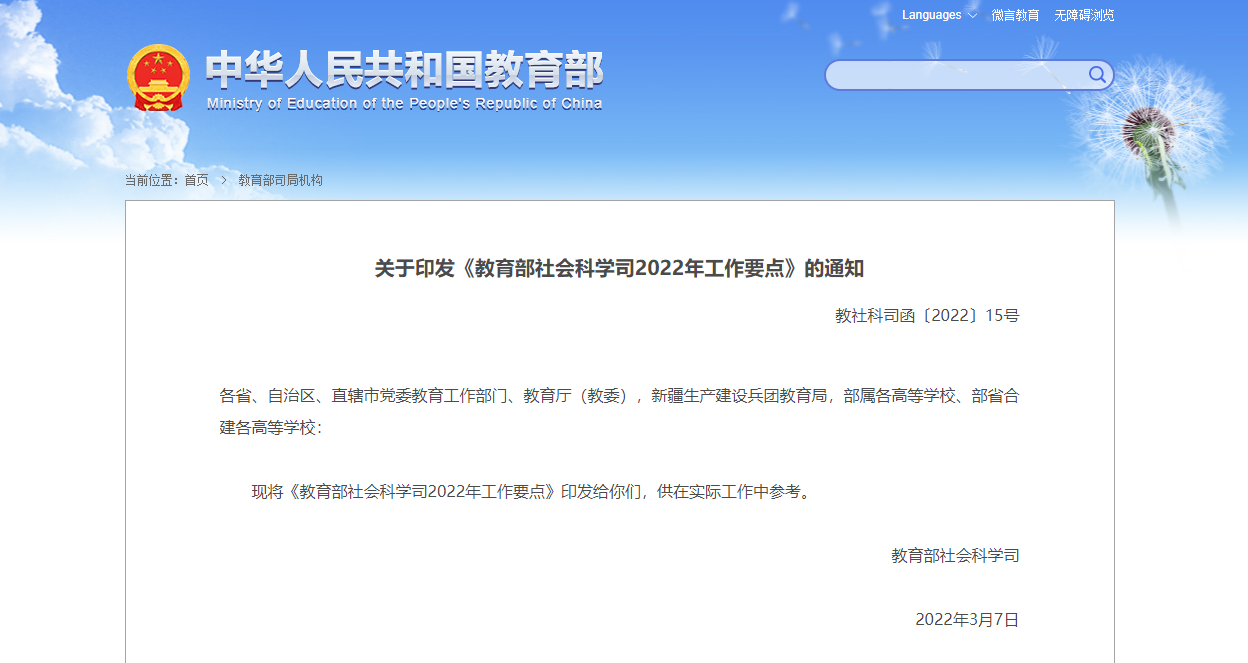 关于印发《教育部社会科学司2022年工作要点》的通知